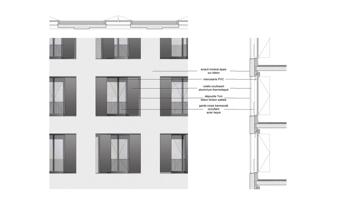 Notre proposition architecturale se veut réaliste et pragmatique pour respecter nos objectifs mais aussi le coût de construction. Nous proposons de rester dans une véracité constructive avec une architecture graphique et unitaire pour l’ensemble du projet. Cette écriture architecturale sobre et contemporaine ne recherche pas à se démarquer mais plutôt à s’inscrire dans la démarche générale du PUP : La composition des façades se réfère donc aux façades lyonnaises rythmées autour d’une trame de plein-vide régulière avec un percement de base vertical.