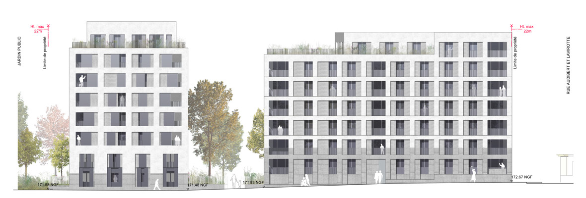 Ouvrir le coeur d’îlot, relativement clos, sur les rues Audibert et Lavirotte au Nord, Patay à l’Est comme sur le jardin public au Sud offrant des perspectives physiques et visuelles entre la rue, le parc et le cœur d’îlot, tout en as