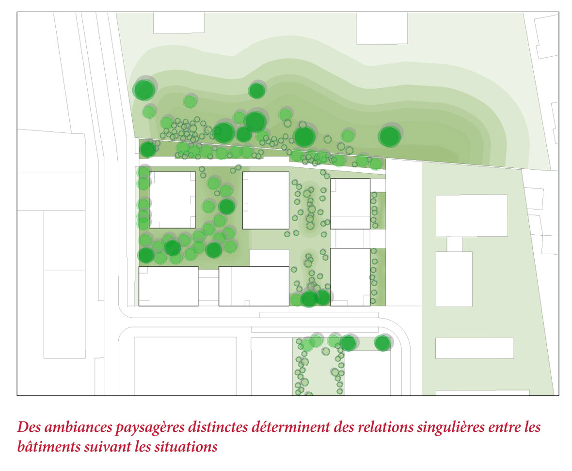 Sur l’ensemble de la parcelle, nous avons souhaité établir des porosités tant longitudinales que transversales qui, à l’échelle du piéton, proposent des césures amples sur le système paysager. Ainsi, un jeu subtil de gradation de la hauteur du bâti et des strates végétales installe des ambiances singulières pour chaque espace du projet.